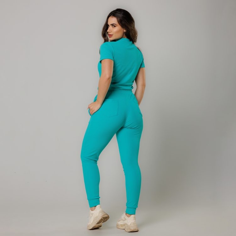 O Scrub Alluring é confeccionado em malha tecnológica composta por poliamida e elastano com uma textura de microrelevos, o que garante total cobertura e zero transparência. A blusa é estilo baby look, com decote em "V" e manga curta. A calça de cintura alta estilo cenoura é mais soltinha na parte de cima e vai afinando em direção ao tornozelo, possui bolsos frontais e traseiros, tem também cordão no cós. A malha tecnológica usada na confecção dos Scrubs Sottile é semelhante a utilizada em roupas de atletas de alta performance, foi desenvolvida com tecnologias que garantem saúde e bem estar para os profissionais, tais como: elasticidade, conforto térmico, proteção antiviral, ação antibacteriana que impede o mau odor, proteção UV50+, toque macio e geladinho. De modelagem moderna e cores lindas, o conjunto Scrub composto por blusa e calça veste tão bem que pode ser usado no dia a dia, além do ambiente de trabalho.