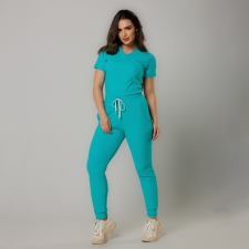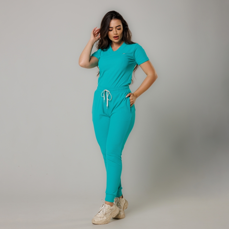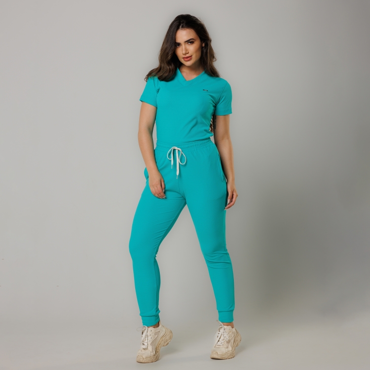 O Scrub Alluring é confeccionado em malha tecnológica composta por poliamida e elastano com uma textura de microrelevos, o que garante total cobertura e zero transparência. A blusa é estilo baby look, com decote em "V" e manga curta. A calça de cintura alta estilo cenoura é mais soltinha na parte de cima e vai afinando em direção ao tornozelo, possui bolsos frontais e traseiros, tem também cordão no cós. A malha tecnológica usada na confecção dos Scrubs Sottile é semelhante a utilizada em roupas de atletas de alta performance, foi desenvolvida com tecnologias que garantem saúde e bem estar para os profissionais, tais como: elasticidade, conforto térmico, proteção antiviral, ação antibacteriana que impede o mau odor, proteção UV50+, toque macio e geladinho. De modelagem moderna e cores lindas, o conjunto Scrub composto por blusa e calça veste tão bem que pode ser usado no dia a dia, além do ambiente de trabalho.