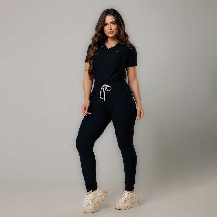 Scrub composto por blusa de manga curta, decote V, modelagem ampla. Calça de cós alto em elástico de 5 cm, com bolsos frontais e traseiros, acabamento em punho. Aplicação na blusa de placa Sottile personalizada tamanho 2,5cm com banho dourado, prata ou chumbo.