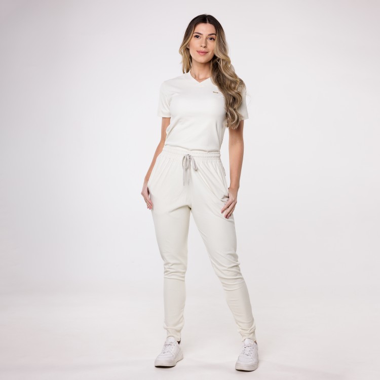 Scrub composto por blusa de manga curta, decote V, modelagem ampla. Calça de cós alto em elástico de 5 cm, com bolsos frontais e traseiros, acabamento em punho. Aplicação na blusa de placa Sottile personalizada tamanho 2,5cm com banho dourado, prata ou chumbo.
