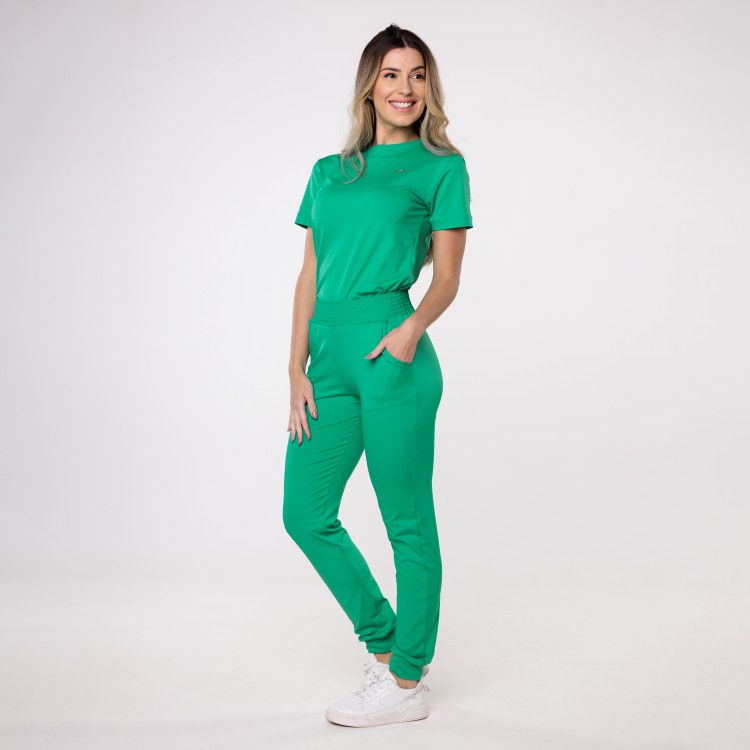 Scrub composto por blusa com manga curta, decote em gola redonda, modelagem baby look. Calça estilo jogger justa, de cintura média-alta, cós em elástico de 6 cm, com bolsos frontais, acabamento no tornozelo em punho do mesmo tecido. Aplicação na blusa de placa Sottile personalizada tamanho 2,5cm com banho dourado, prata ou chumbo.