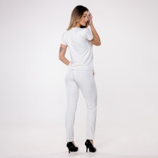 Scrub composto por blusa de manga curta, decote V, modelagem ampla. Calça reta, cintura média, cós em elástico de 4cm, com bolsos frontais, acabamento em bainha. Aplicação na blusa de placa Sottile personalizada tamanho 2,5cm com banho dourado, prata ou chumbo.