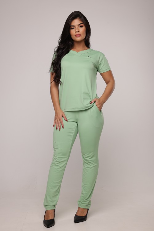Scrub composto por blusa de manga curta, decote V, modelagem ampla. Calça reta, cintura média, cós em elástico de 4cm, com bolsos frontais, acabamento em bainha. Aplicação na blusa de placa Sottile personalizada tamanho 2,5cm com banho dourado, prata ou chumbo.