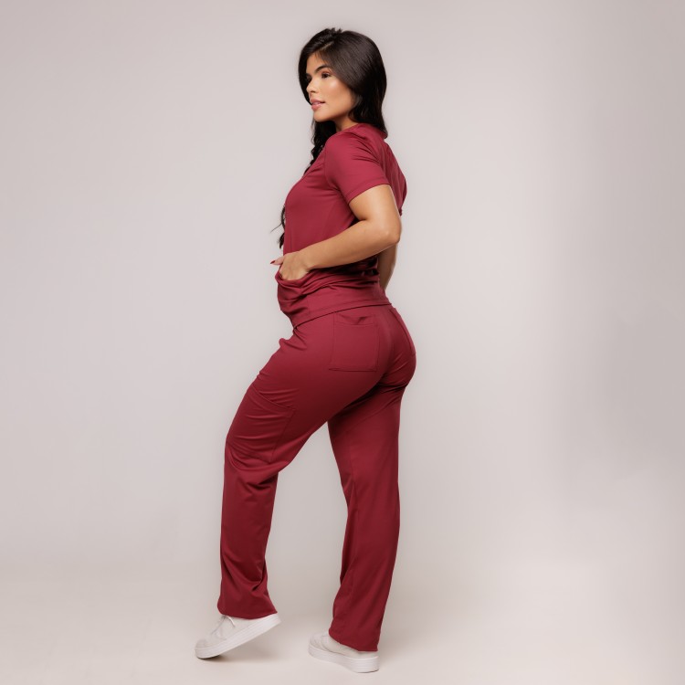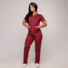 Scrub composto por blusa de manga curta, decote V, modelagem baby look e 2 bolsos frontais. Calça reta, cintura média, cós em elástico de 5cm e cordinha, com bolsos frontais, bolsos laterais, bolsos traseiros acabamento em bainha. Aplicação na blusa de placa Sottile personalizada tamanho 2,5cm com banho dourado, prata ou chumbo.