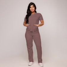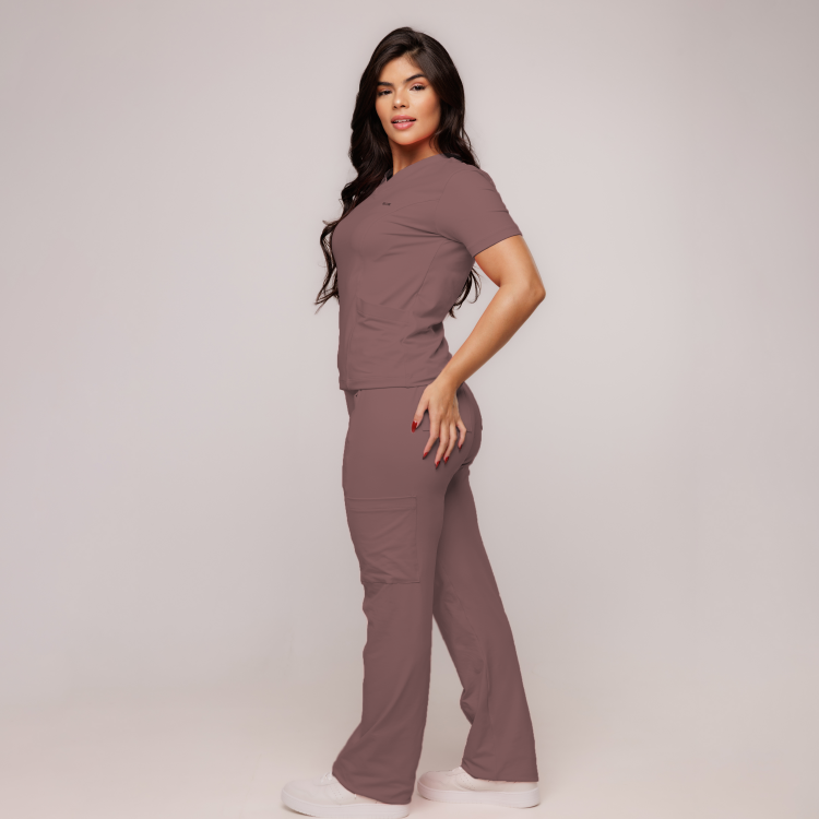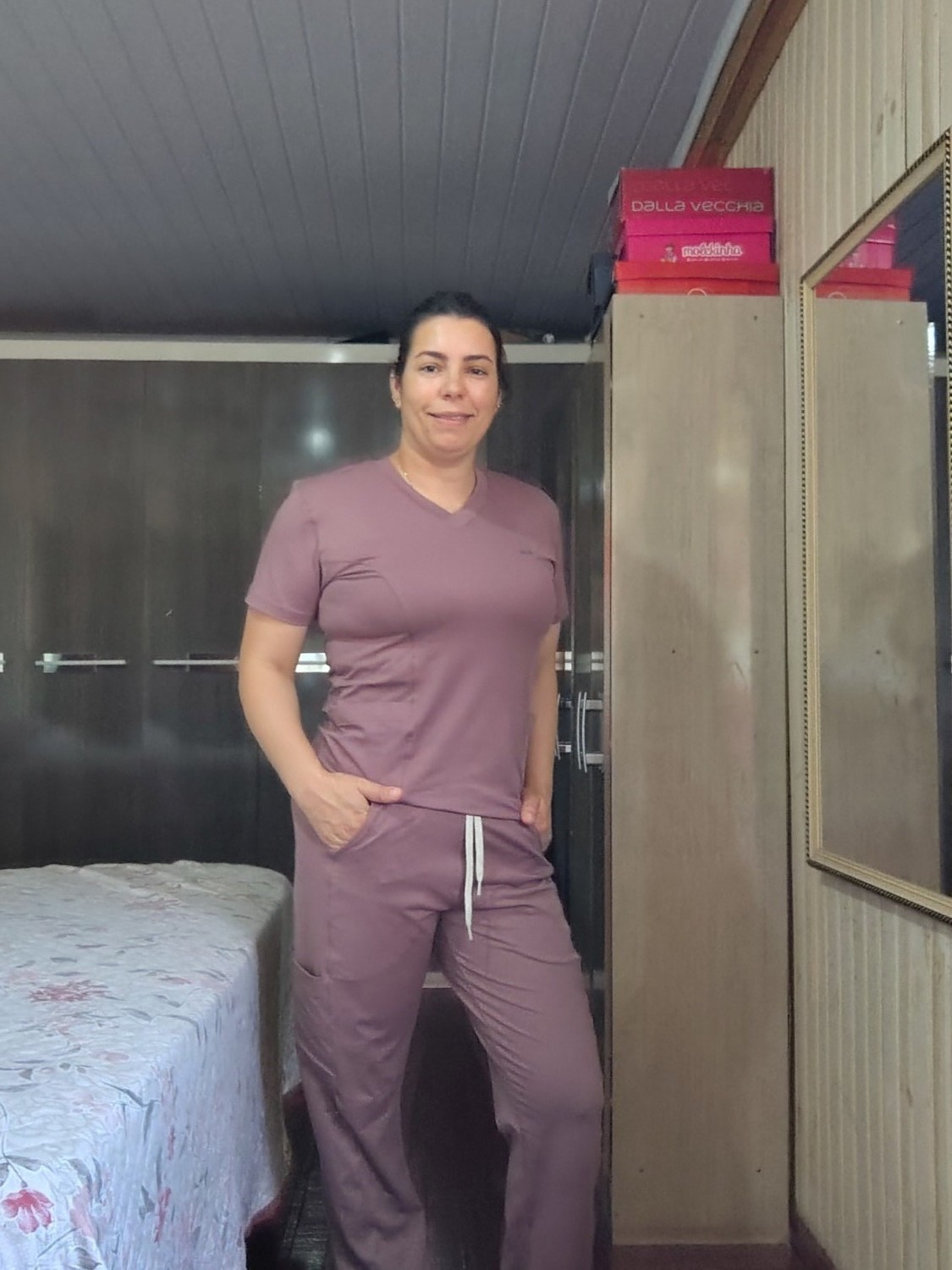 Scrub composto por blusa de manga curta, decote V, modelagem baby look e 2 bolsos frontais. Calça reta, cintura média, cós em elástico de 5cm e cordinha, com bolsos frontais, bolsos laterais, bolsos traseiros acabamento em bainha. Aplicação na blusa de placa Sottile personalizada tamanho 2,5cm com banho dourado, prata ou chumbo.