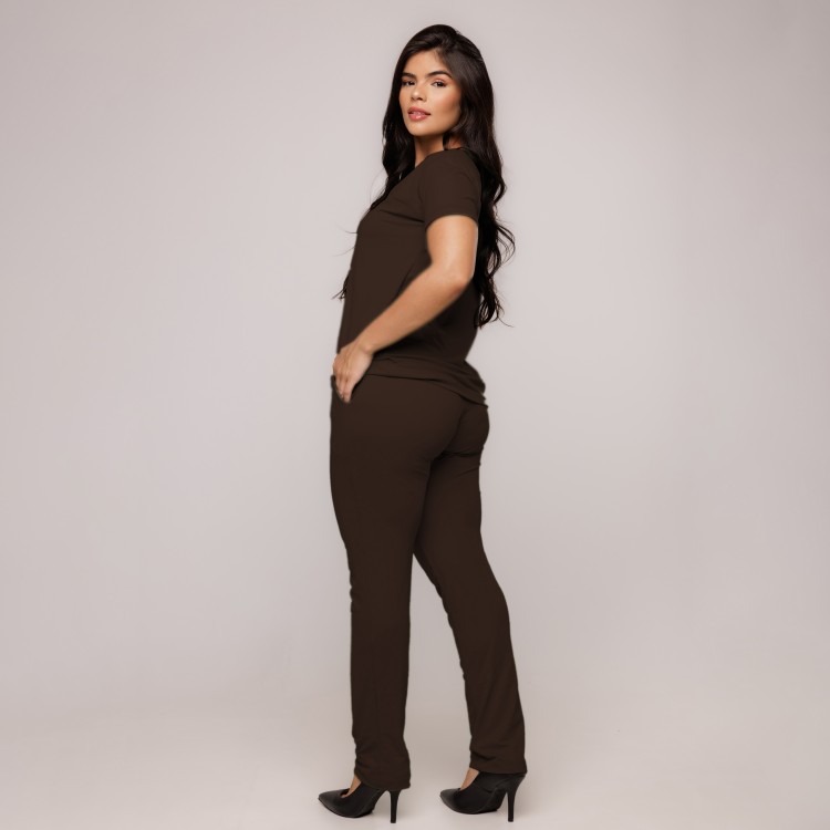 Scrub composto por blusa de manga curta, decote V, modelagem ampla. Calça reta, cintura média, cós em elástico de 4cm, com bolsos frontais, acabamento em bainha. Aplicação na blusa de placa Sottile personalizada tamanho 2,5cm com banho dourado, prata ou chumbo.