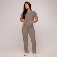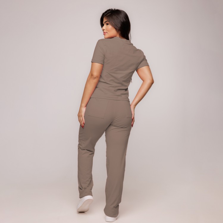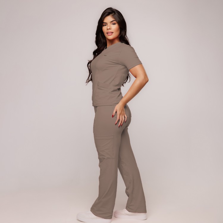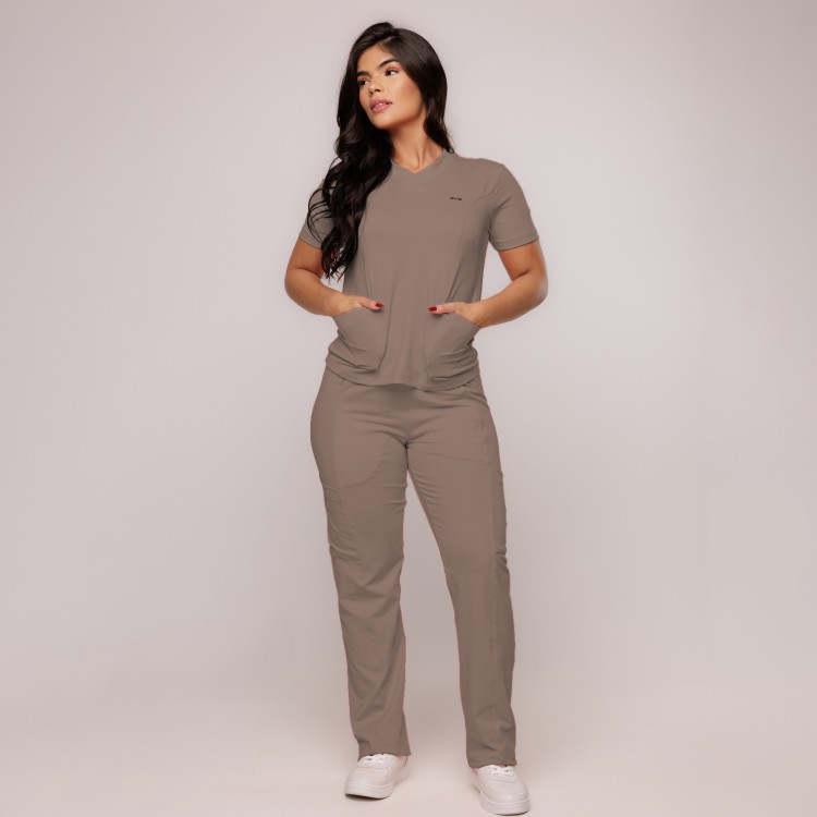 Scrub composto por blusa de manga curta, decote V, modelagem baby look e 2 bolsos frontais. Calça reta, cintura média, cós em elástico de 5cm e cordinha, com bolsos frontais, bolsos laterais, bolsos traseiros acabamento em bainha. Aplicação na blusa de placa Sottile personalizada tamanho 2,5cm com banho dourado, prata ou chumbo.