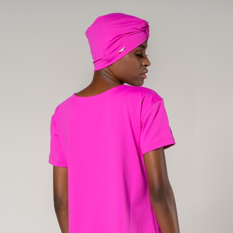 Turbante 2 em 1: pode ser usado como touca cobrindo toda a cabeça ou pode ser usada estilo tiara. O tecido composto por poliamida e elastano foi desenvolvido e aprimorado com tecnologias de ação antibacteriana, além de proporcionar agradável sensação de "geladinho", proteção UV50+ e repelência a água. As fibras elásticas que compõem o tecido tecnológico permitem total ajuste a cabeça, com toque extremamente macio e benefícios que ajudam no conforto e na saúde dos profissionais que utilizam esse acessório no dia a dia.