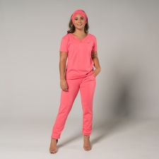 Scrub composto por blusa de manga curta, decote V, modelagem ampla. Calça reta, cintura média, cós em elástico de 4cm, com bolsos frontais, acabamento em bainha. Aplicação na blusa de placa Sottile personalizada tamanho 2,5cm com banho dourado, prata ou chumbo.