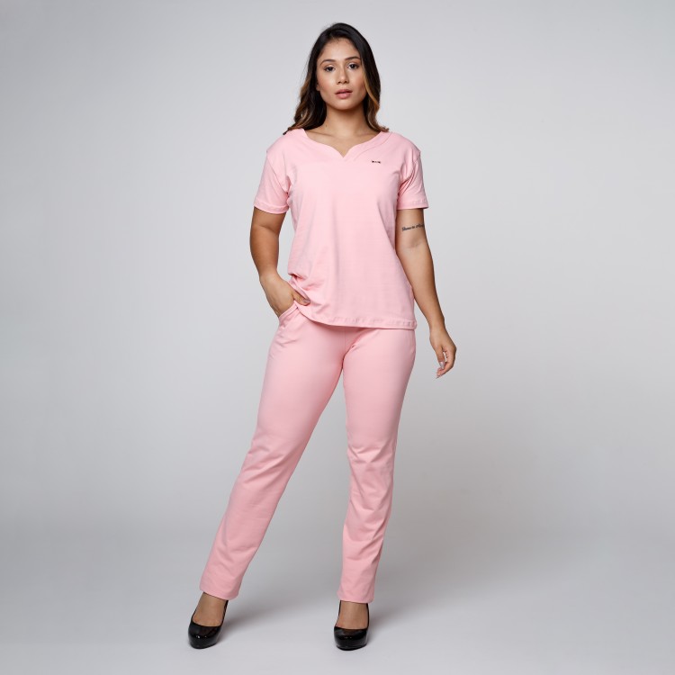Scrub composto por blusa de manga curta, decote V, modelagem ampla. Calça reta, cintura média, cós em elástico de 4cm, com bolsos frontais, acabamento em bainha. Aplicação na blusa de placa Sottile personalizada tamanho 2,5cm com banho dourado, prata ou chumbo.