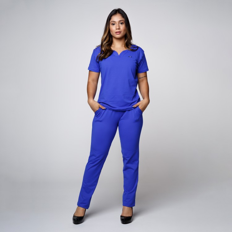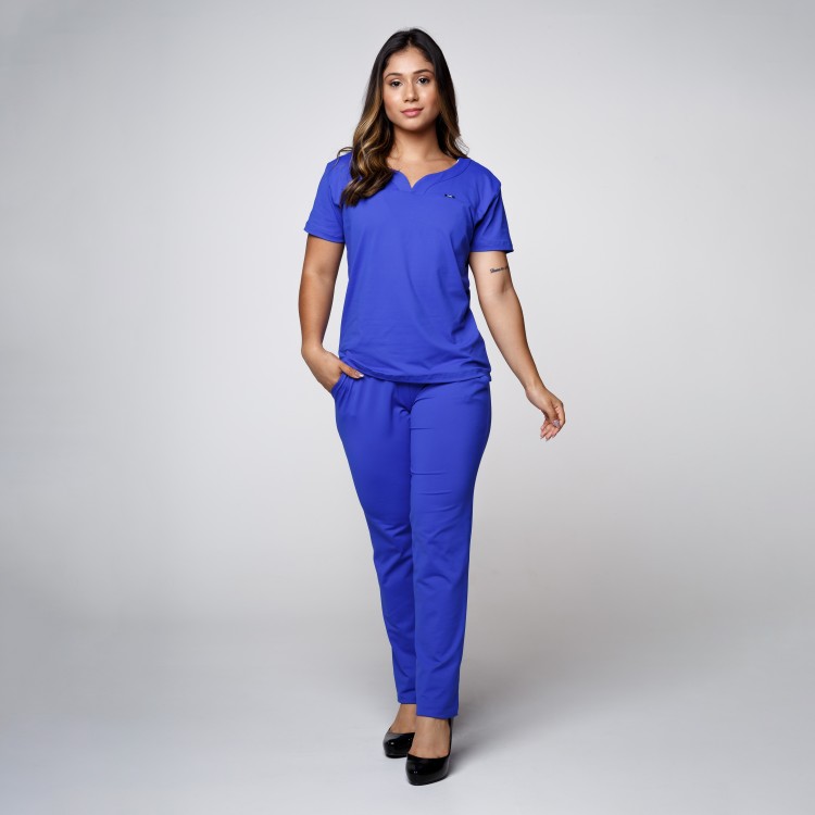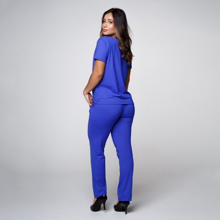 Scrub composto por blusa de manga curta, decote V, modelagem ampla. Calça reta, cintura média, cós em elástico de 4cm, com bolsos frontais, acabamento em bainha. Aplicação na blusa de placa Sottile personalizada tamanho 2,5cm com banho dourado, prata ou chumbo.