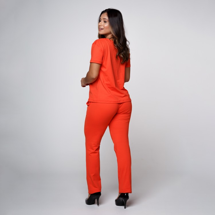 Scrub composto por blusa de manga curta, decote V, modelagem ampla. Calça reta, cintura média, cós em elástico de 4cm, com bolsos frontais, acabamento em bainha. Aplicação na blusa de placa Sottile personalizada tamanho 2,5cm com banho dourado, prata ou chumbo.